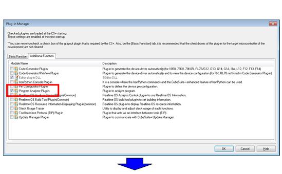 In the default setting of CS+, the Pin Configuration and Code Generating functions are not available.