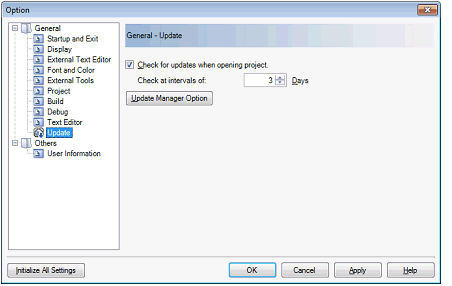 This function is executed when: in the Option dialog box, in the [General - Update] category, the [Check for updates when opening project.] check box is selected, and the conditions set in [Check at intervals of] are met.
