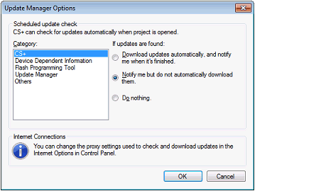 The auto-update facility automatically performs some or all of the operations that are available with the manual update facility every time a project is opened in the CS+.