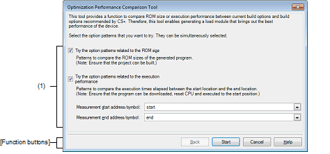 When trying an option pattern related to optimization of the execution speed, specify the measurement range in [Measurement start address/symbol] and [Measurement end address/symbol].