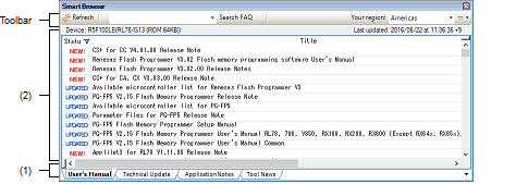 Loads the latest list of documents from the Renesas Web site. If the information on the panel is refreshed without trouble and there have been changes, the dates of "Last updated" and the list of documents are updated.
