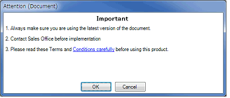 When you attempt to open a document from the [User's Manual] tab, the dialog box shown below appears. Read the notifications and click on [OK] to confirm that you are using the latest version and have read the terms and conditions, and have contacted your nearest sales office if you are working towards implementation in a product.