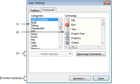 When "(All Commands)" is selected in the [Categories] area, the name of all commands that CS+ provides are displayed, together with their icons (if exist).