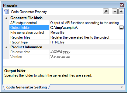 The Code Generator is used to change the output destination folder for the source code by selecting [Code Generator Setting] tab >> [Generate File Mode] >> [Output folder] in the Property panel.