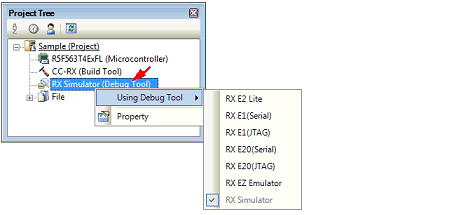 To select or switch the debug tool, use the context menu shown by right clicking on the [Microcontroller type Debug tool name (Debug Tool)] node on the Project Tree panel.