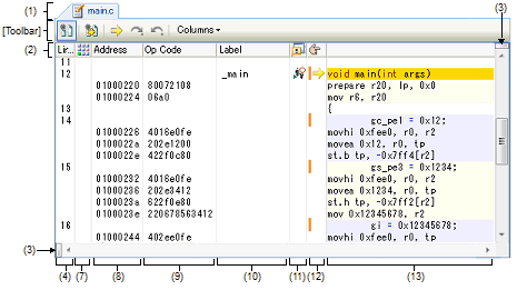 Displays bookmarks, address marks and the current PC mark. Furthermore, sets breakpoints (see "(12) Main area"). |