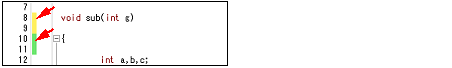 When the coverage function is valid, lines corresponding to the specified coverage measurement area are shown highlighted based on the code coverage measurement result that is acquired by executing the program (the color depends on the coverage color in the [General - Font and Color] category of the Option dialog box).