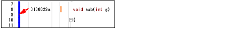 Note that the current PC mark is only displayed if the current PC value corresponds to the source text line, when the state of the debug tool is changed from execution to stop.