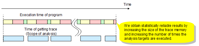 In the previous example, wet set a breakpoint, and set the scope of analysis to running the main routine one time. In this example, however, we describe how to derive the execution ratios statistically, by executing the analysis range as many times as will fit in the trace memory.