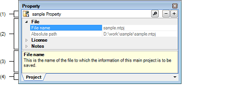 Select either one of the Project node, Subproject node, Microcontroller node, Design Tool node, Build Tool node, Debug Tool node, Analyze Tool node, file, or Category node in Project Tree panel. Then select [Property] in [View] menu, or in the context menu. |