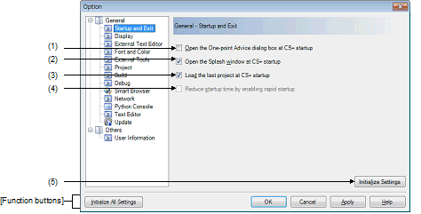 (1) | [Open the One-point Advice dialog box at CS+ startup] |