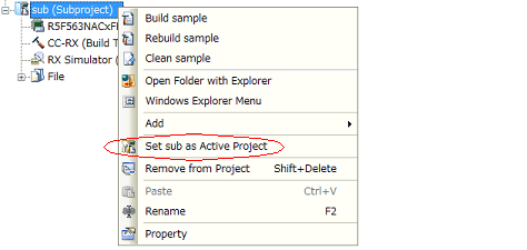 To set the active project, select the main project or subproject to be set as the active project on the project tree and select [Set selected project as Active Project] from the context menu.