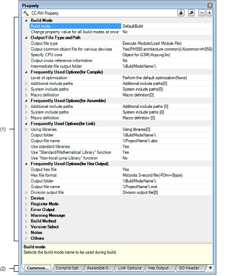 This panel is used to display the detailed information on the Build tool node, file, or Configuration Tool for Multi-core node that is selected on the Project Tree panel by every category and change the settings of the information.