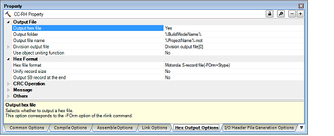 This category is displayed only when [Yes] in the [Output hex file] property in the [Output File] category is selected.