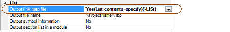 To output the library list file, set the [Output link map file] property in the [List] category.