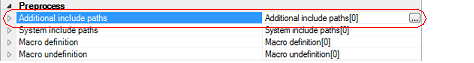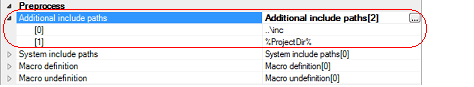 To change the include paths, you can use the [...] button or enter the path directly in the text box of the subproperty.
