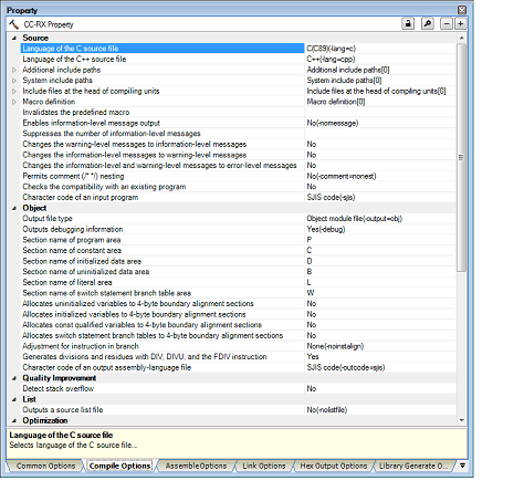 Selects to apply MISRA C rule. This property is usable only in the Professional Edition. In case of misra2012 and in case of CC-RX V2.05.00 or earlier, even if [C99(-lang=c99)] is selected in the [Language of the C source file] property, MISRA C checking is done in the range of C89 specification. This option corresponds to the -misra20XX option of the compiler. |