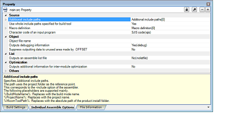 This tab shows the detailed information on an assemble source file categorized by the following and the configuration can be changed.