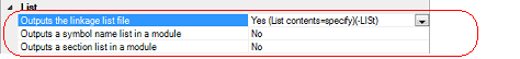 To output the library list file, select [Yes (List contents=specify) (-LISt)] in the [Outputs the linkage list file] property.