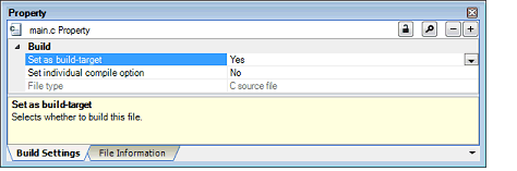 This property is displayed only when a C source file is selected on the project tree and [Yes] in the [Set as build-target] property is selected.