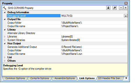 For details on compiler driver options, refer to "MULTI: Building Applications for Embedded V850 and RH850" released by Green Hills Software. Please do not contact Green Hills Software with any inquiries about the CCRH850 build-tool plugin of CS+. |
