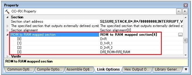 Section information file (User-Own Coding Module), it is necessary to perform setting to map sections placed on ROM to sections placed on RAM by using "-rom" linker option. Set [Link Options] tab of [Property] panel for [CC-RX (Build Tool)] like