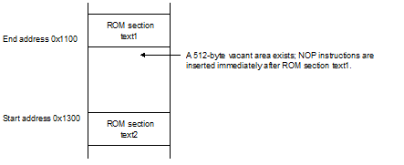 NOP instructions are inserted when a 128-byte or larger vacant area exists between two ROM sections (executable program sections or sections (except program sections) allocated to the ROM area) or between a ROM section and a RAM section (a section allocated to the RAM area). |