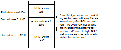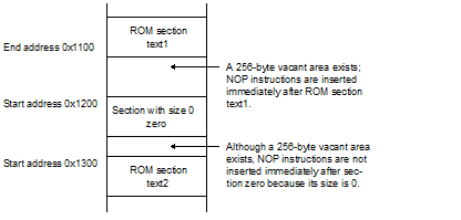 NOP instructions are inserted when a 128-byte or larger vacant area including a section with size 0 exists immediately after a ROM section. |
