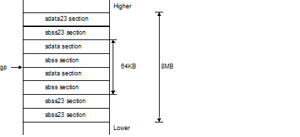 Remark | The sum of sdata- and sbss-attribute sections is 64 KB. gp is the center of the sdata section and sbss section. |