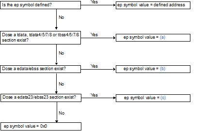 If there are no data, tdata4/5/7/8, tbss4/5/7/8, edata, ebss, edata23, or ebss23 sections, then the address value of the ep symbol is set to zero (0).