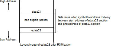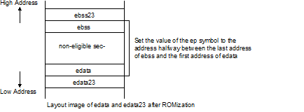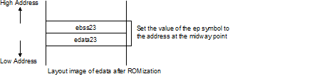 Sets the halfway point between the start address of the edata23 or ebss23 section with the smallest address, and the end address of the edata23 or ebss23 section with the greatest address (multiple of 2; if the midway point is an odd number, takes the first multiple of two) as the address value of the ep symbol.