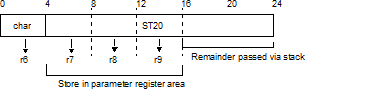 For example, when passing the value of a 20-byte structure argument, 16 bytes are passed in r6 to r9, and the remaining 4 bytes (the 5th parameter word) are passed on the stack.