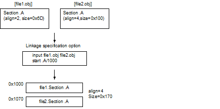 The optimizing linker (hereafter abbreviated "rlink") concatenates identical sections in the input relocatable files, and allocates them to the address specified by the -start option.