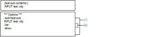 The option strings specified by a command line or a subcommand file are output. The following figure shows an example of option information output when rlink -subcommand=test.sub -list-show is specified.