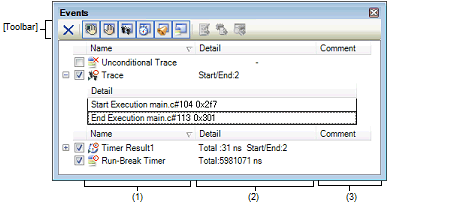 This panel is used to display the detailed information about the events that are set on the Editor panel/Disassemble panel/Watch panel. On this panel, you can change the setting state of the event between valid/invalid and delete the event (see "2.17 Manage Events").