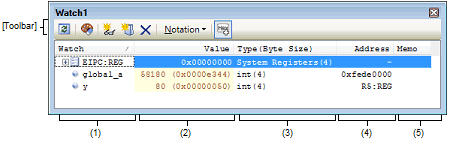 Note that when the selected watch-expression value is not 4-byte data, or has the type information, displays it in the default notation (see "Table A.7 Display Format of Watch-Expressions (Default)").