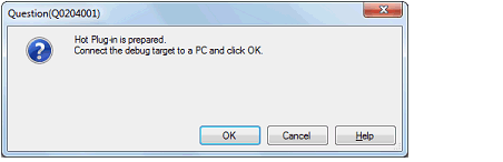 Following message will appear once you are ready to start hot plug-in connection. Connect the emulator to the target system and click [OK]. This will start the communication with the debug tool which is selected in the currently active project.