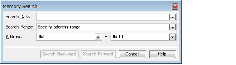 Values of memory can be searched in the Memory Search dialog box that is opened by selecting [Find...] from the context menu. The search is operated either in the memory value area or character strings area, in which the caret exists. In this dialog box, follow the steps below.