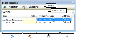 For details on the contents and function in each area, see the section for the Local Variables panel.