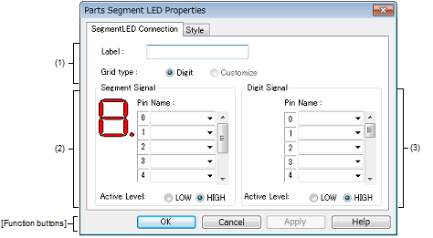 This property dialog box is used to set or change the pin connection information of 7-segment LED and 14-segment LED, which are one of the connection parts in the I/O Panel window.