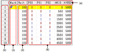 In the Wait area, specify the timing at which the input value is input to each pin as "wait time" (see "Wait area").