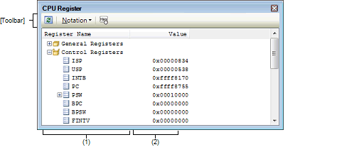 This panel displays the contents of the CPU registers (general-purpose and control registers) and change register values (see "2.11.2 Displaying and changing the CPU registers")