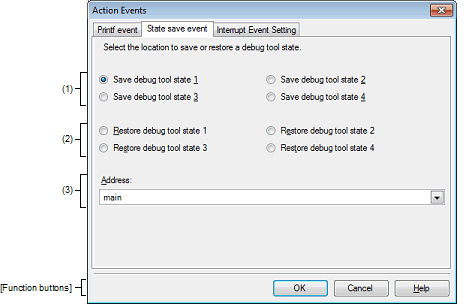 This tab is used to configure how to save and restore the state of the debug tool upon occurrence of an action event.