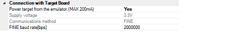 From the drop-down list, select the baud rate (FINE baud rate) to be used by the E1 emulator for communicating with the microcontroller on the target system.