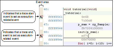 When trace start and trace end events are set, the following event marks are displayed in the event area of the relevant line or address.