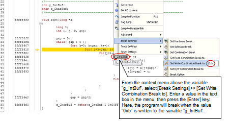 If you have specified a value in the text box in the menu, a break will occur only when the specified value is used for the reading or writing. On the other hand, if no value is specified, reading or writing the selected watch-expression by any value will cause the break to occur.