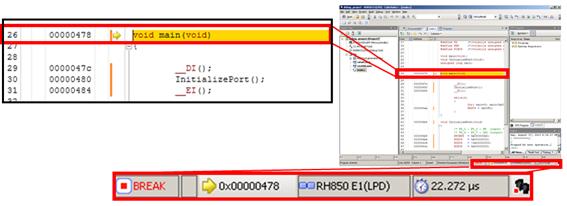 A program counter (PC) is a control register that holds information on the next program address. When the RH850 microcontroller generates a reset signal, PC is set to the reset vector address H00000000.In the program of this tutorial, address H478 is set after resetting. In the default setting of CS+, C source code is displayed after running the program from the reset address to the beginning of the main function when the Reset button is pressed in order to enhance the efficiency of program development using the C source code. You can change this behavior by [Download File Setting] tab in the Debug Tool Property.