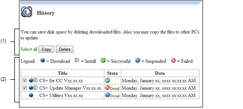 Use this page to display the history of updates performed, and to copy or delete update files.