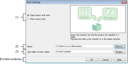 The target project folder for packing is in the folder specified as the location to save the project (Example: A project folder is specified as the top folder of the packing target and a folder above the project folder is specified as the location to save the project folder).
