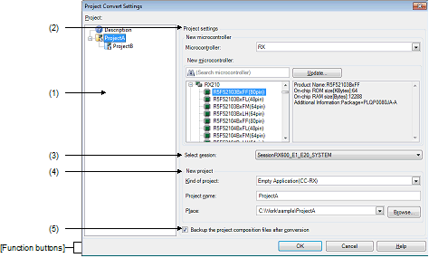 This dialog box includes the settings for conversion from e2 studio and the old development environment (CubeSuite, HEW, PM+) project (or workspace) to a CS+ project.